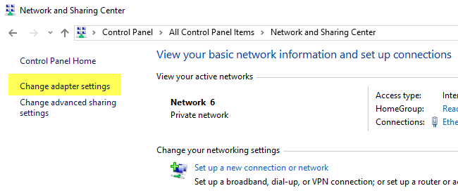 To do this, click on Control Panel, go to icons view and then click on Network and Sharing Center. On the left hand side, click on Change adapter settings.