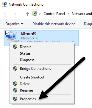 Right-click on the network adapter that is currently being used for your Internet connection and then select Properties.