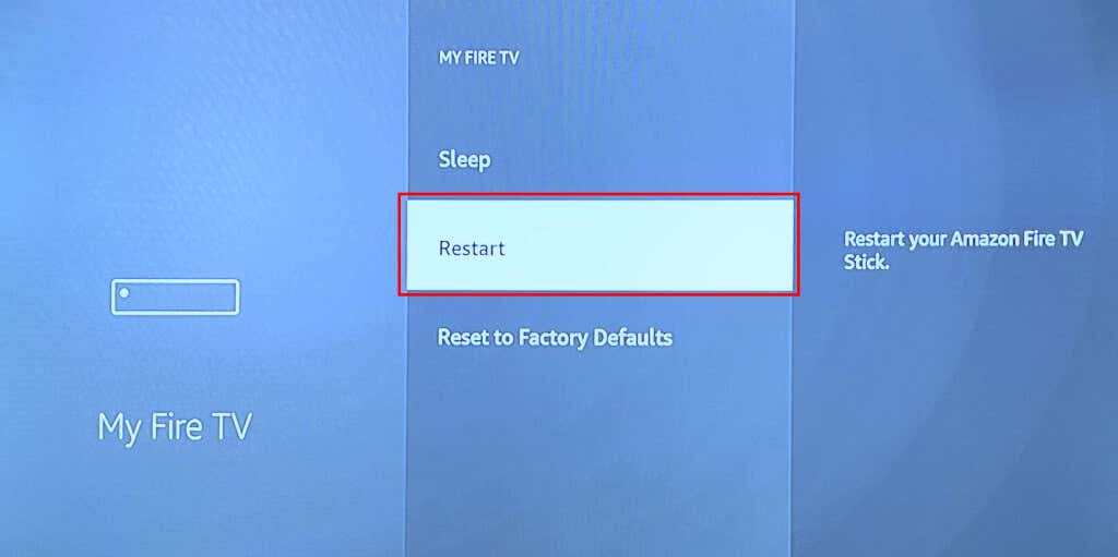 Head to Settings > My Fire TV > Restart and select Restart on the confirmation screen.