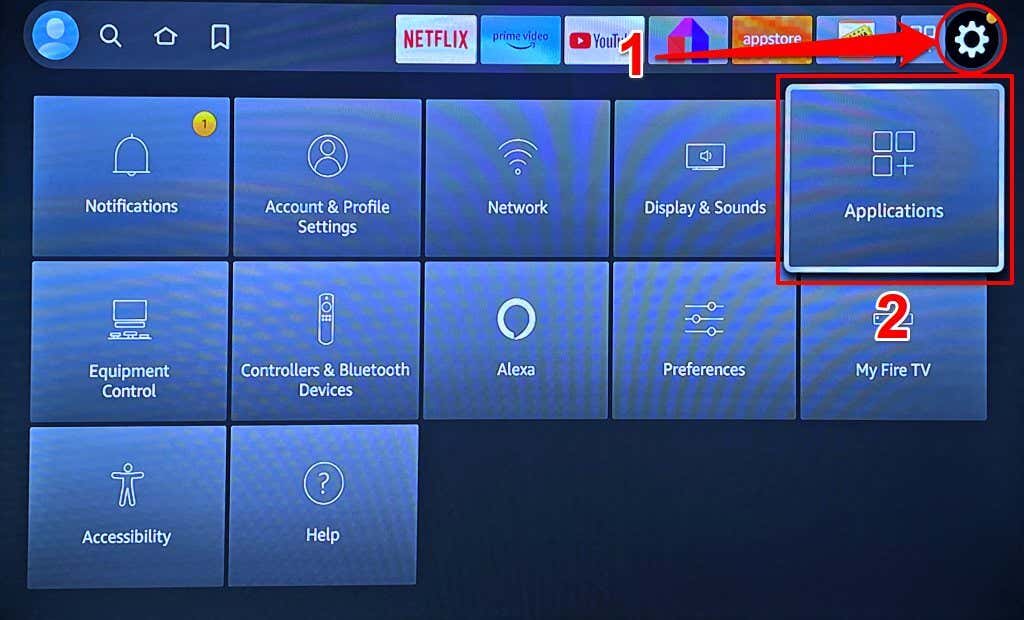 - Select the gear icon in the top-right corner of your Fire TV home screen.