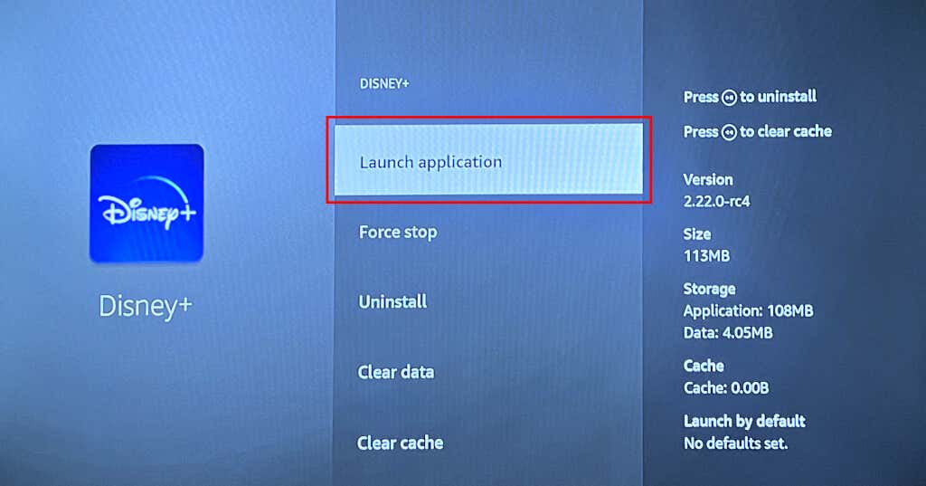 - Wait 5-10 seconds and select Launch application to reopen Disney+ Plus.
