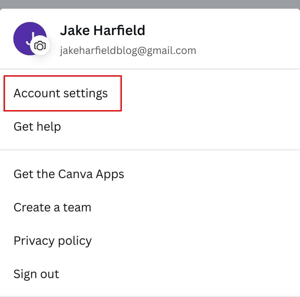 2. Choose the gear icon in the top-right corner to open your Canva Account settings.