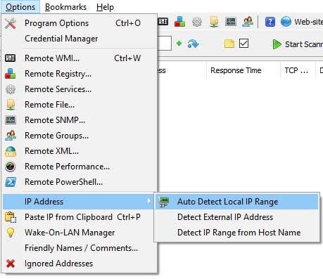 Once the program loads, you’ll need to enter your network starting and ending IP address range. If you don’t know this, don’t worry. Just click on Options, IP Address and then click on Auto Detect Local IP Range.
