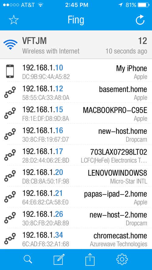 Fing is a free app that is available on the Google Play store and the iTunes store and has a great looking interface. You don’t have to worry about entering any IP address range with these apps because they figure it out on their own. Once you start a scan with Fing, you’ll get a nice looking list of devices with some basic info like hostname, MAC address, IP address etc.