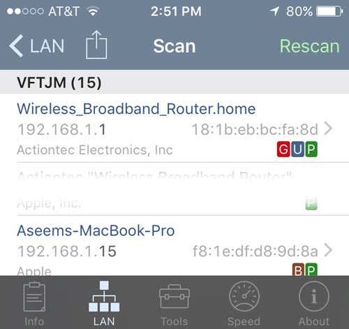 Using this app, I got 15 devices, which was pretty close to the total number of devices on the network. With Net Analyzer, you’ll also see some colored letters on devices that have certain services enabled. The green P means it is pingable, the brown B means Bonjour services are available (Apple devices), the red G means it’s a gateway device (router, etc), and a blue U means UPNP and DLNA services are available.