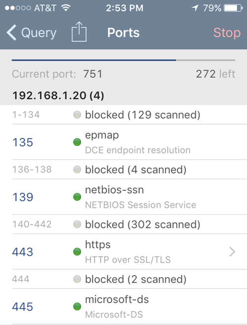 As the scan progresses, you’ll see the ports that are open and active and also which ports are blocked. The app also has other tools that you can use to scan specific devices on the network to get more information.