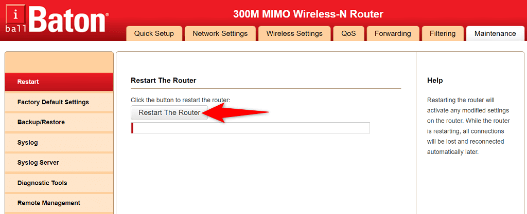 The way you do that depends on your router model. With most routers, you can access the router’s settings page in a web browser, open the Maintenance or similar section, and choose the reboot option to restart the router.