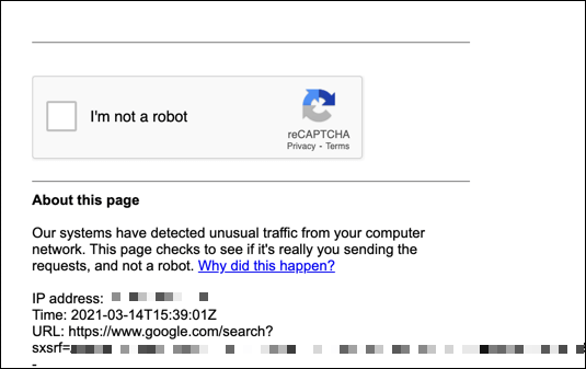 If Google is blocking your search traffic without a good cause (as far as you’re aware), you can usually bypass it by performing the CAPTCHA test. CAPTCHA is a system designed to limit non-human web traffic (such as automated scraping bots) by introducing a test that “only” humans using a typical web browser can solve.