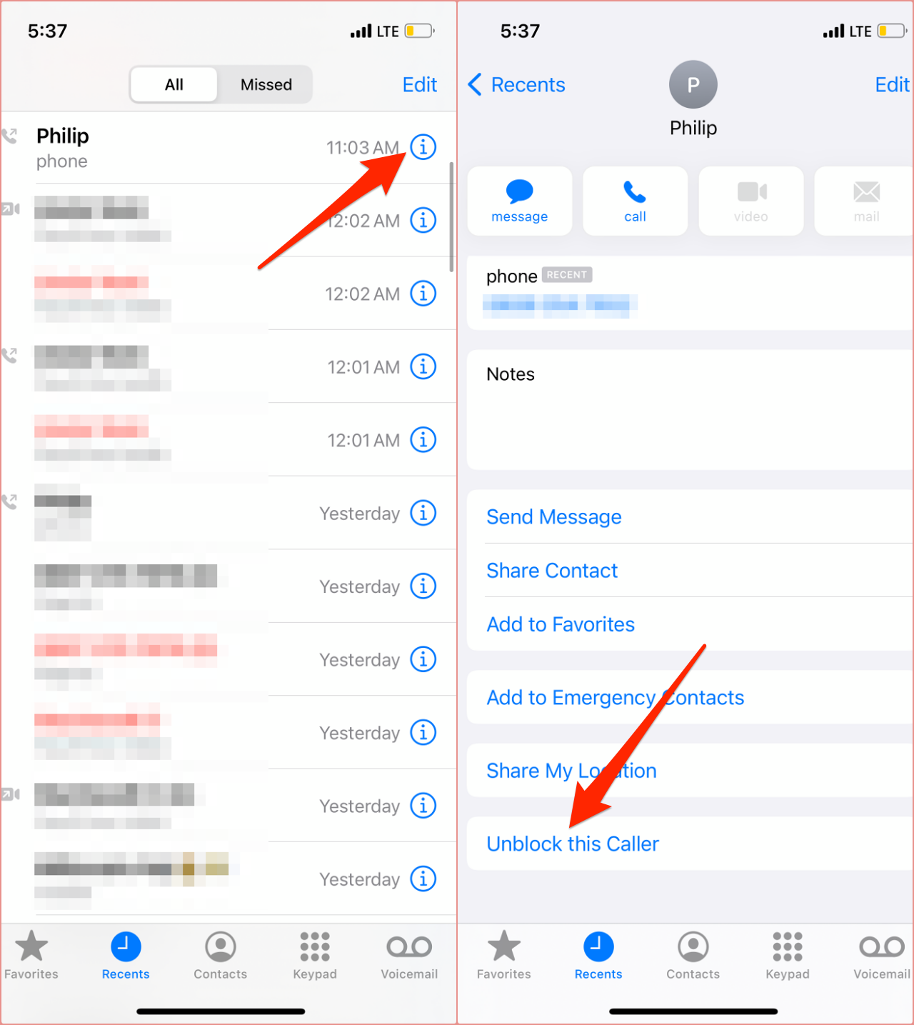 Launch the Phone app, tap the info icon next to the number you want to unblock, and tap Unblock this Caller.
