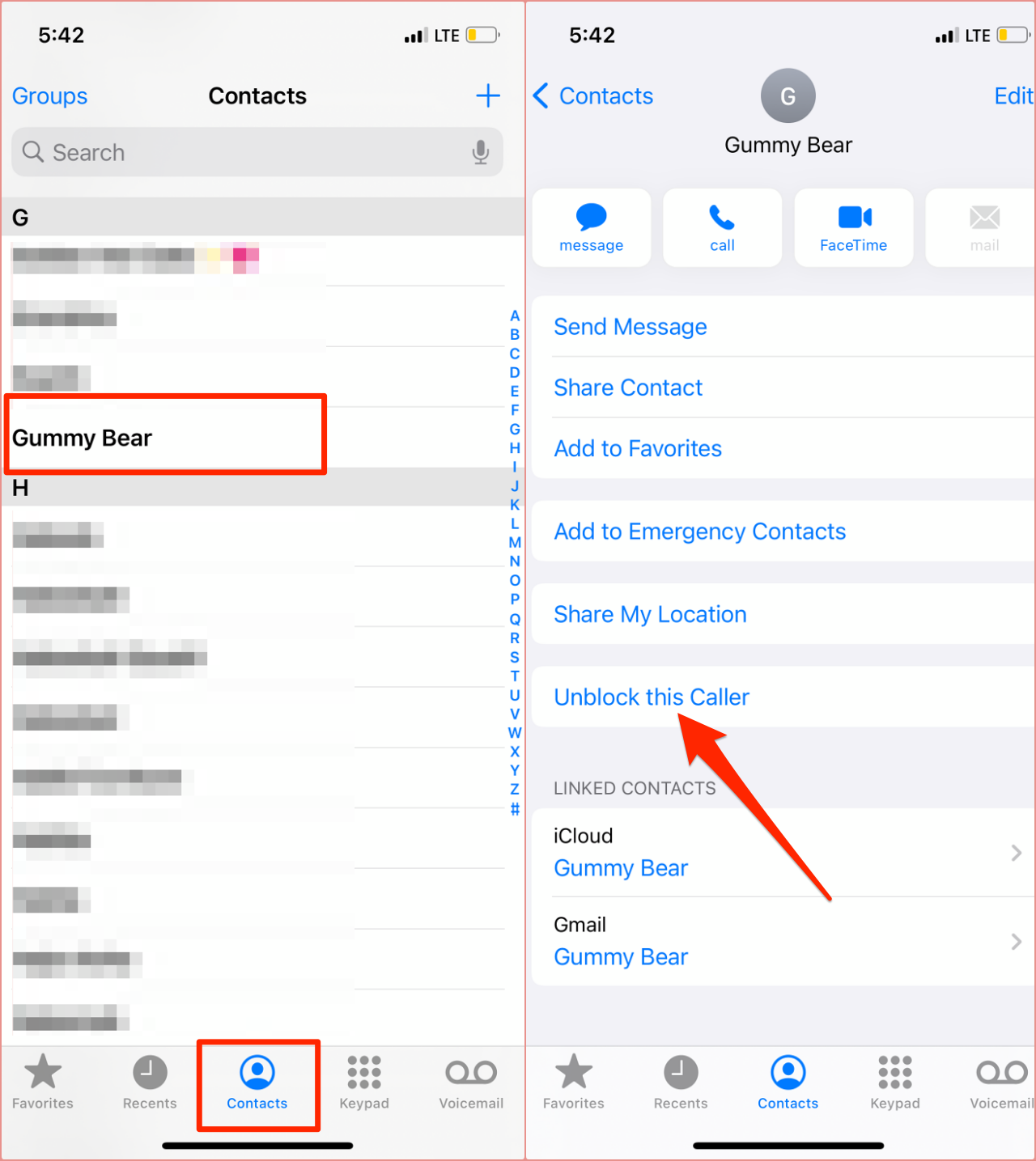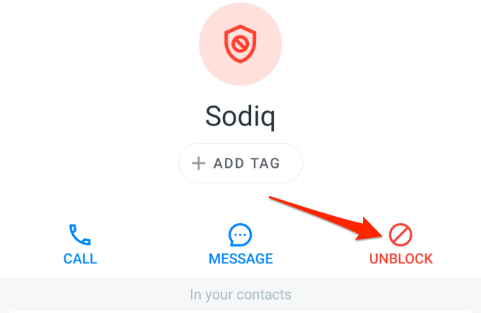 If the contact isn’t in the “Recents” section, head to the Contacts tab, select the contact you want to unblock (use the search bar to locate the contact faster) and select Unblock this Caller.