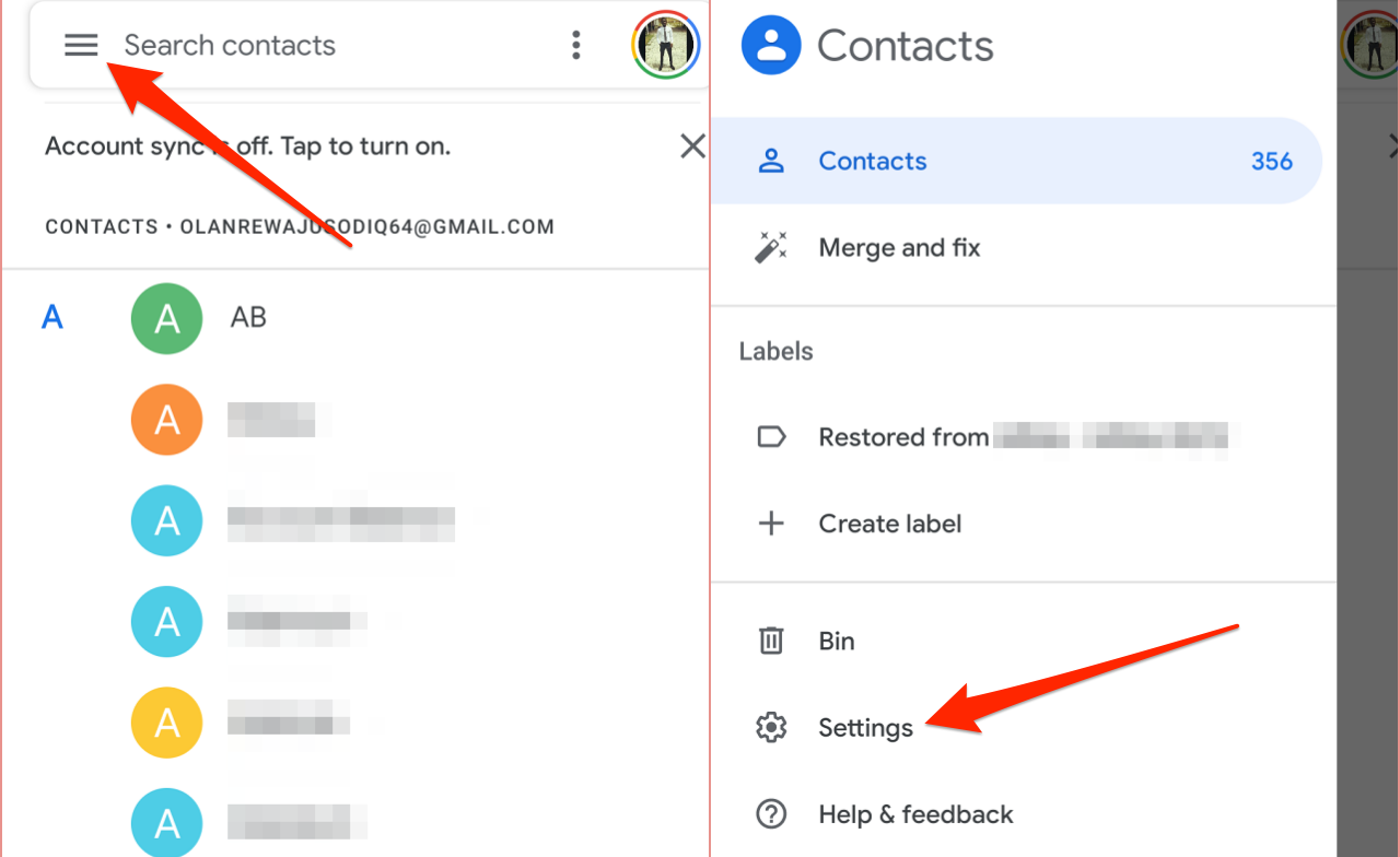 - Launch Contacts, tap the hamburger menu icon on the top-left corner, and select Settings.