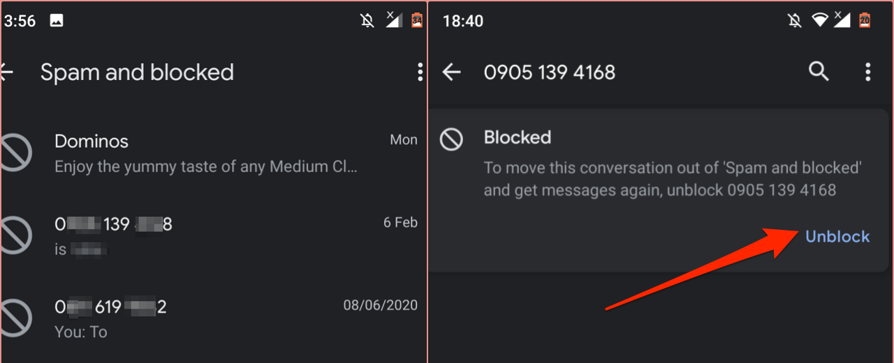 When you report an SMS or MMS as spam, Android adds the number to the list of blocked contacts. Here’s how to check numbers blocked via the default Messages app and how to unblock them: