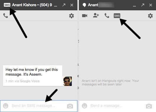 The other service I use for sending SMS messages from my computer is Google Voice and Google Hangouts. Google Voice will let you send text messages directly from the Google Voice service once you sign up for a number, but you can also integrate Google Voice into Google Hangouts so that you can send SMS messages where you use Google Hangouts, i.e. Gmail, iPhone app, etc.