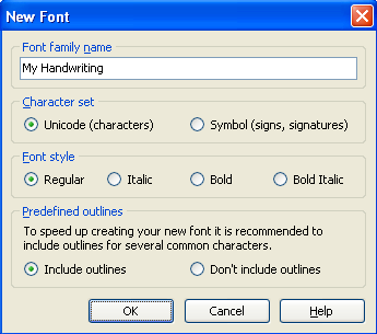 Give your new font a unique name otherwise it will not install properly in Windows later on. This name is not the name of the file; it’s the font name that will be shown inside programs, etc. For example, Times New Roman is the font family name and the file name is actually timesbd.ttf.