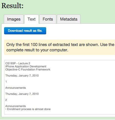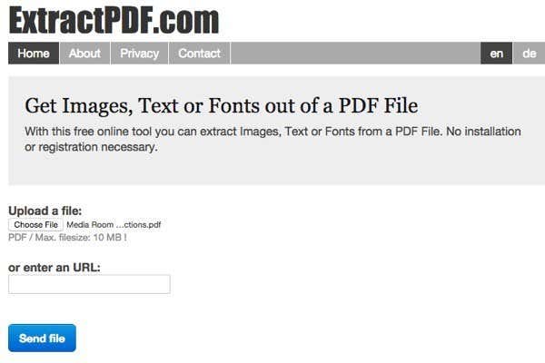 ExtractPDF is a free tool to grab images, text and fonts out of a PDF file. The only limitation is that the max size for the PDF file is 10 MB. That’s a bit small; so if you have a bigger file, try some of the other methods below. Choose your file and then click the Send file button. The results are normally very fast and you should see a preview of the text when you click on the Text tab.