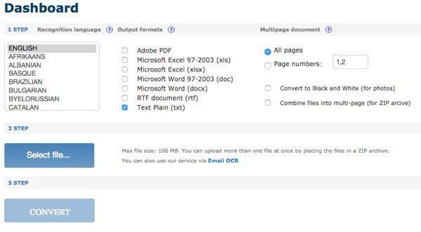 First, choose a language and then pick the type of output formats you would like for the converted file. You have a couple of options and you can choose more than one if you like. Under Multipage document, you can select Page numbers and then choose only the pages that you want to convert. Then you select the file and click Convert!