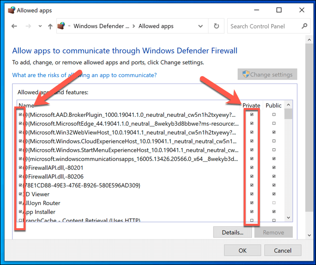 1. In the Windows Firewall menu, select the Allow an app or feature through Windows Defender Firewall. Make sure to select the checkbox next to the Slack app to enable access for Slack through the firewall. If you’re on a public or private network, make sure the checkbox in those categories are enabled, too. You may need to select the Change Settings button first.