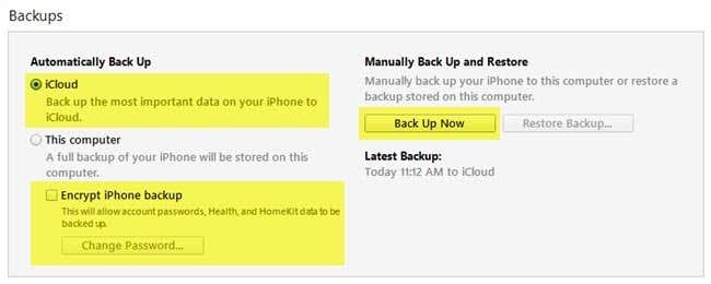 Also, note that you can leave the Automatically Backup Option set to iCloud and simply perform manual local backups every so often. iCloud should backup your phone automatically, but you can always perform a manual iCloud backup by going to Settings, iCloud, Backup and then tapping on Back Up Now. It should also show you the date and time of the last iCloud backup.