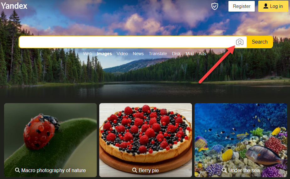 2. There’s no search bar like Google or Yandex. The options to upload the image sit halfway through the screen. Click on the Upload Image button or insert a URL for the image. Next, select Search