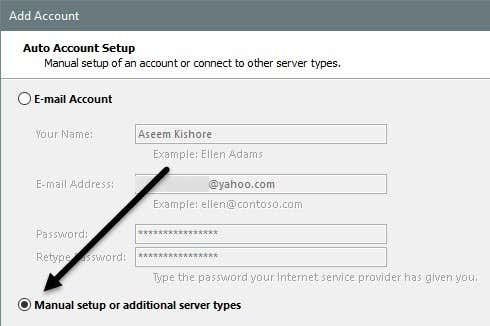 On the next screen, don’t be tempted to click on Email Account because I already tried that and it doesn’t work. For Yahoo, you have to manually enter all the settings, which is a pain, so click on Manual setup or additional server types.