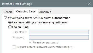 Here, we have to make a couple of changes. First, click on Outgoing Server and make sure the My outgoing server (SMTP) require authentication box is checked. Then click on the Advanced tab.