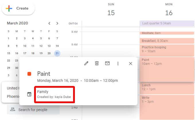 When other members of your family add events to the Family calendar, you’ll see those events appear with the same color code. Then, when you open the event, you can see who created it in the event details pop-up.