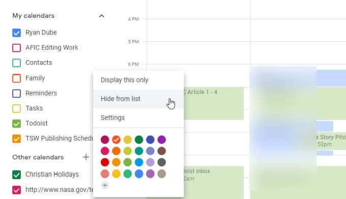 - Hide only this calendar from view.