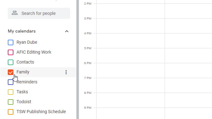 To do this, just select the checkbox to the left of Family in the calendar listing.