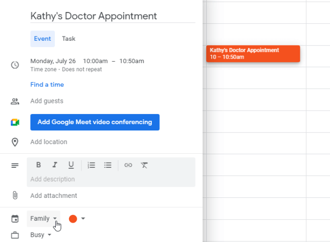 If you want to make this a Google Meet meeting so that you and other family members can have a video chat, just add those users as guests and select Add Google Meet video conferencing.