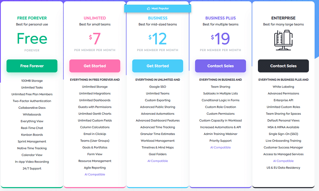 - Business: $12 per month per user. Everything in the Unlimited plan, plus a stack of advanced features like time tracking, automations, public sharing, and more.