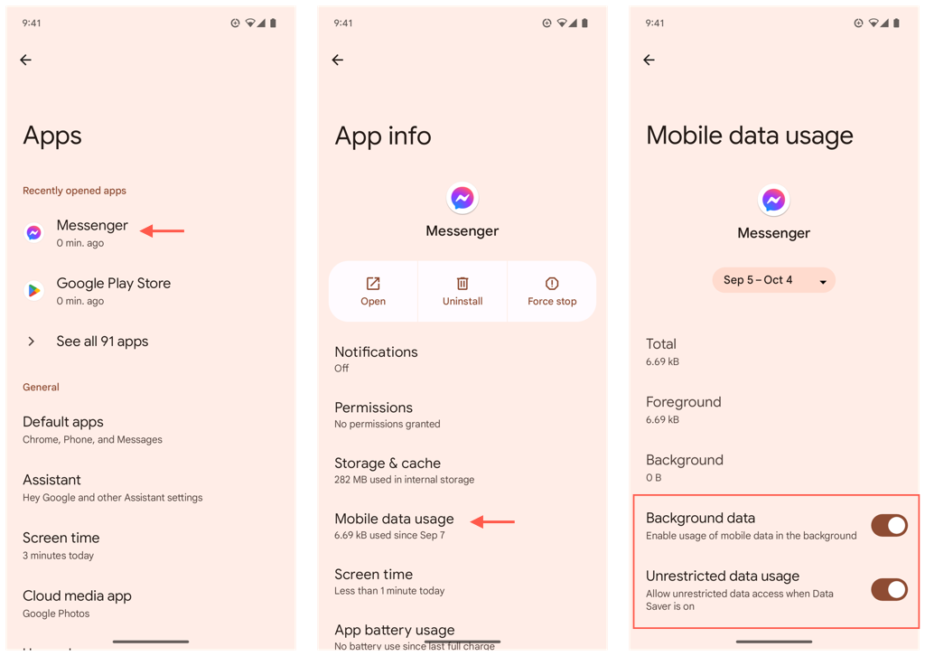 To enable data permissions for Messenger on Android: