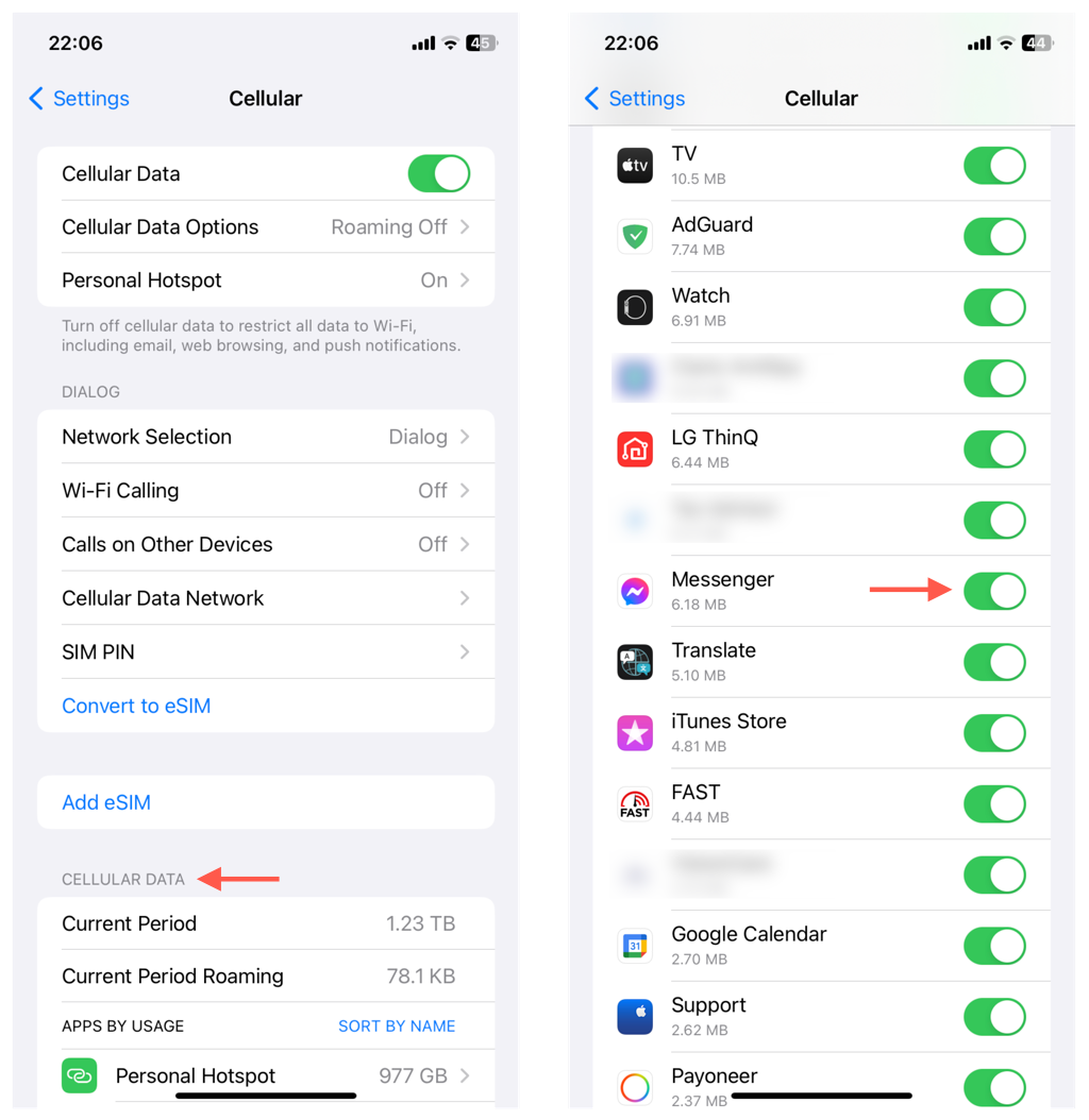 3. Under Cellular Data, locate Messenger and enable the switch next to it.
