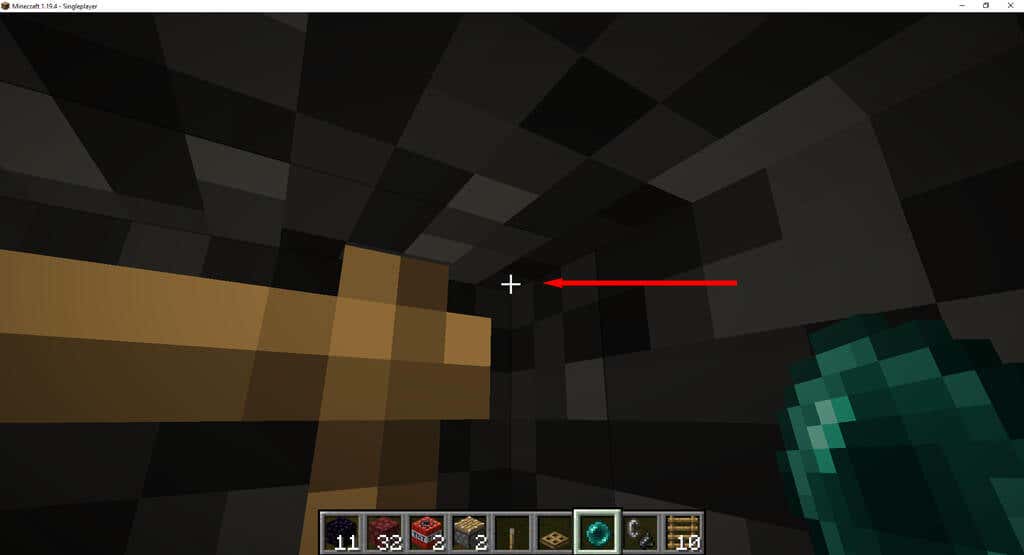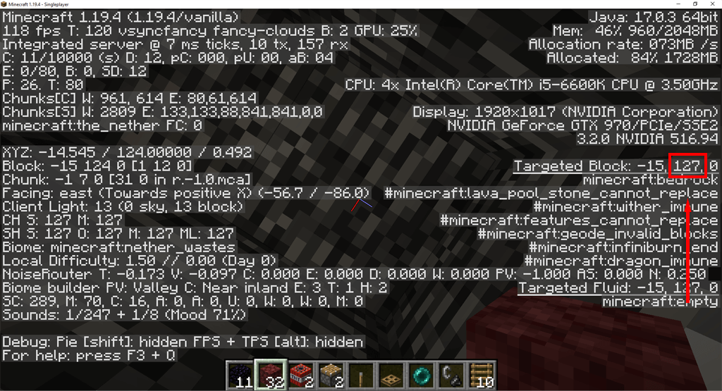 To find this block, press F3 to bring up the debug screen. On the right-hand side, there’s a section labeled “Targeted block.” Keep looking around until you find a bedrock block where the middle number (the Y-axis) is 127.