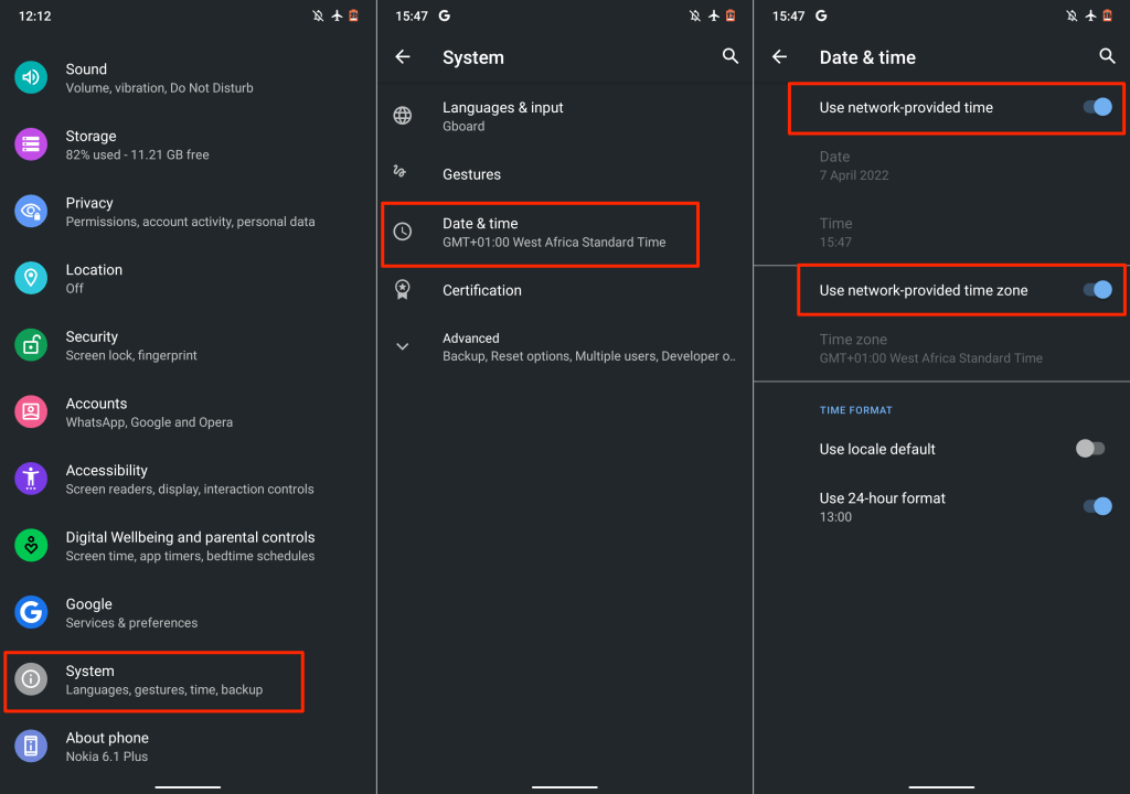 On Android, go to Settings > System > Date & time and turn on both Use network-provided time and Use network-provided time zone.