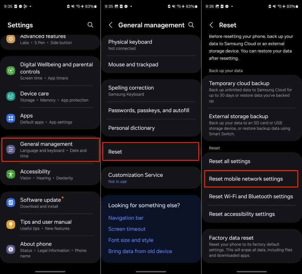 On devices running stock Android, go to Settings > System > Reset options > Reset Mobile Network Settings to initiate a network reset. If you have a Samsung device, go to Settings > General management > Reset > Reset mobile network settings.