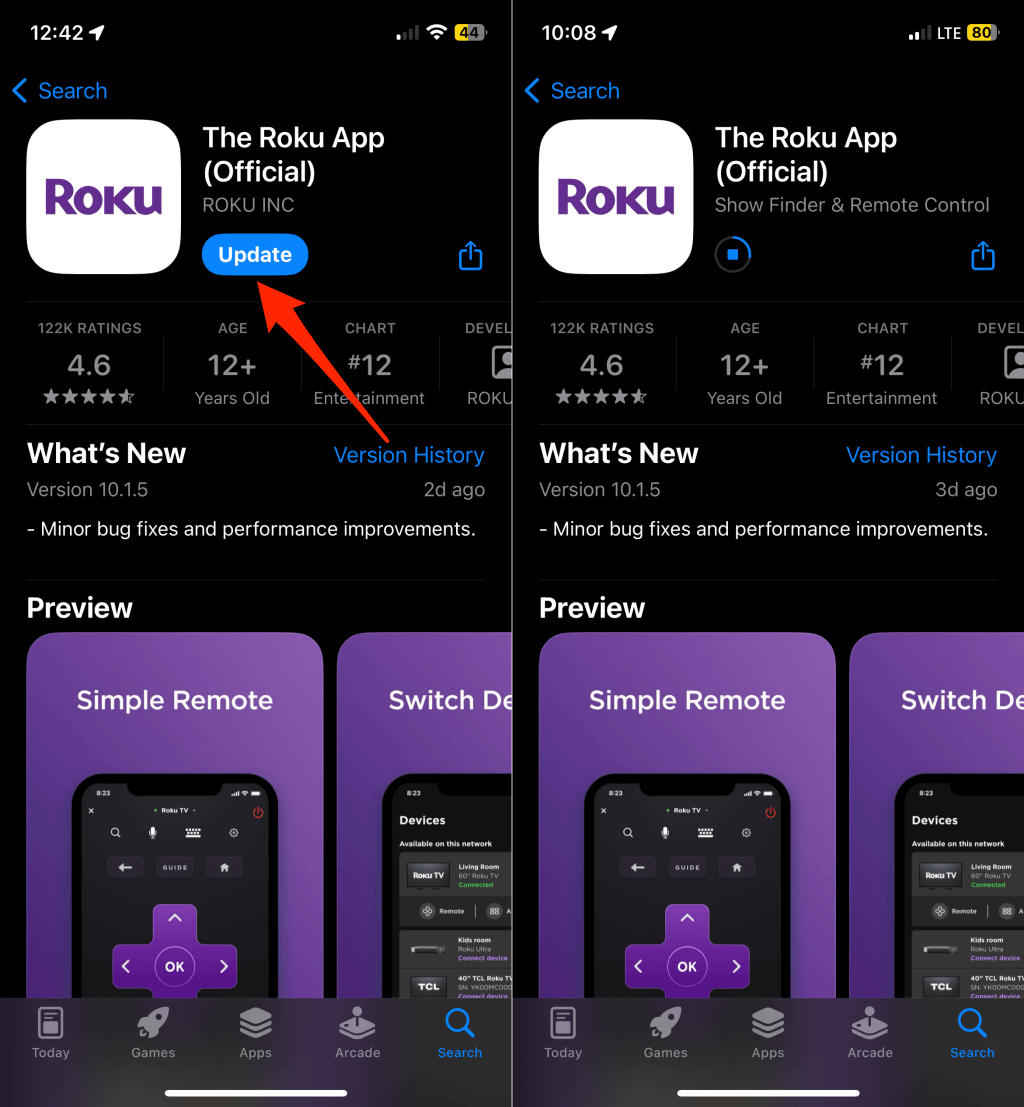 Updates to the Roku mobile app often include fixes for connectivity issues, performance errors, and software bugs. Check the Roku app page on the Google Play Store (Android) or App Store (iPhone/iPad) for updates. Tap the Update button to install the latest app version on your device.