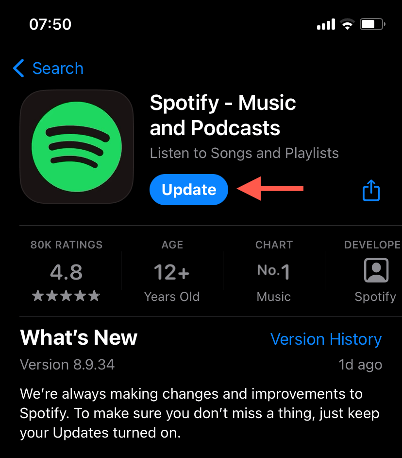 To ensure Spotify is up to date, visit the App Store or launch Google Play and search for Spotify. If you see an Update button next to Spotify, tap it.