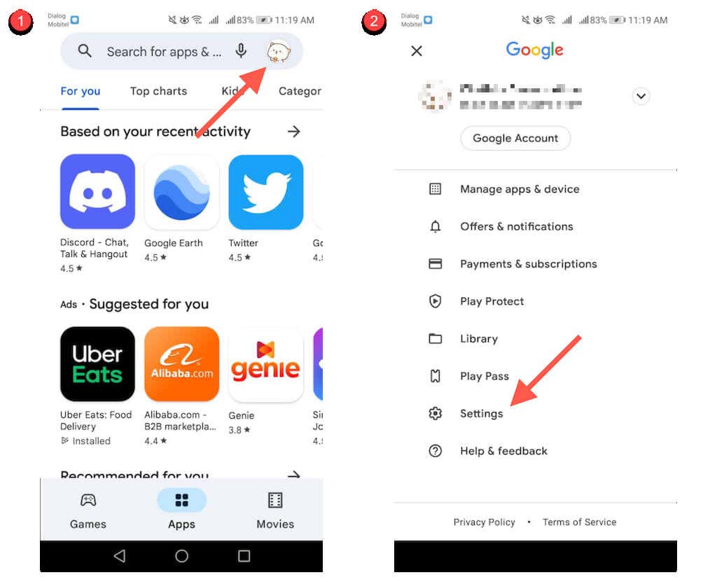1. Tap your profile icon at the top-right of the Google Play Store and select Settings.