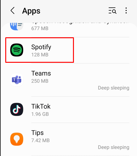 - Find Spotify in the list of installed apps and tap on it to reveal more options.