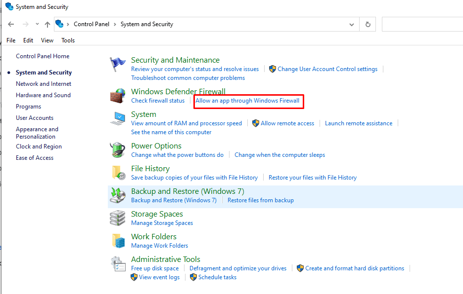 - Under the Windows Defender Firewall option click Allow an app through Windows Firewall.