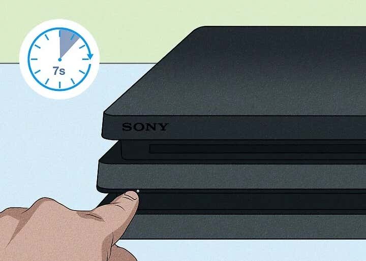 1. Press and hold the power button until you hear a second beep. It’ll take about seven seconds. The location of the power button will depend on the model of the Sony PlayStation 4 console you have: