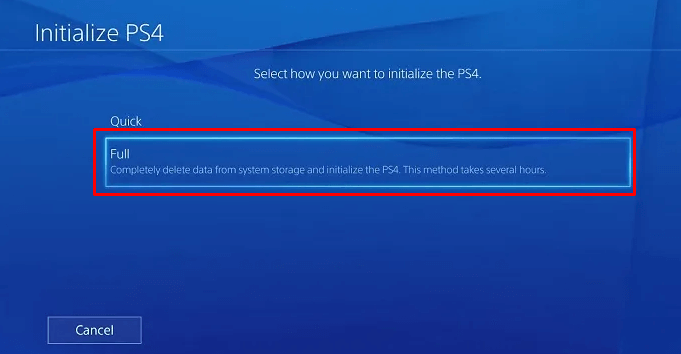 1. On the next screen, select the Full option. This will completely delete the PS4 system storage.