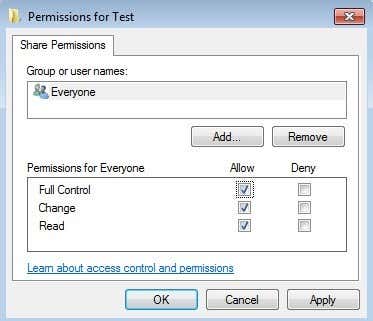 6. Shared Permissions – If you are getting the You might not have permission to use this network resource…Access is Denied message, your problem could also be that the permissions for the shared directory are not properly set.