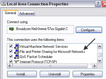 3. File and Printer Sharing – Make sure that file and printer sharing is turned on for the network adapter. You can enable this by going to Control Panel, Network Connections, right-clicking on the network connection, choosing Properties and making sure File and Printer Sharing for Microsoft Networks is checked.