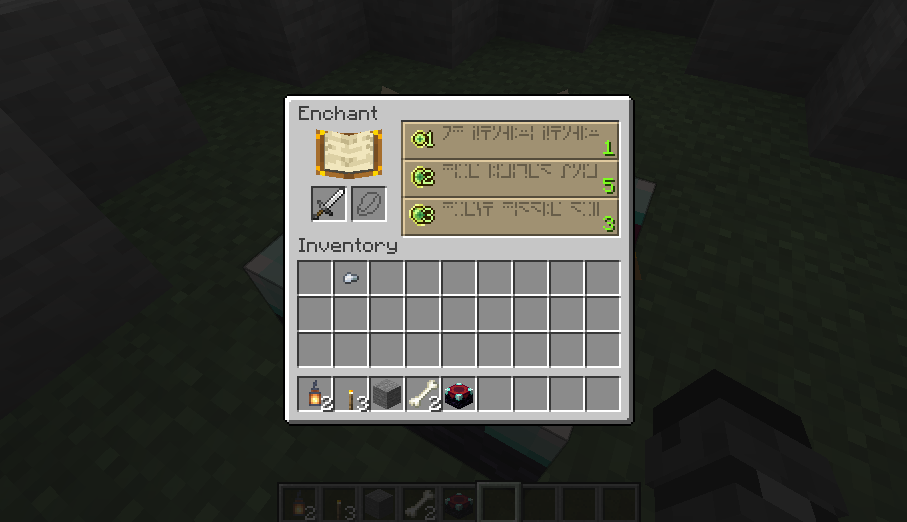 This makes it impossible to tell what a particular enchantment does by the text alone, besides giving it the look of a mysterious runic inscription from a fantasy world. And the letters aren’t entirely random — they are in a different alphabet, with each symbol corresponding to a letter in English.