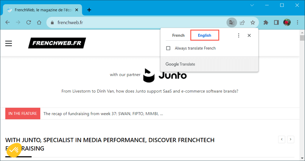 1. Select the Translate icon and choose the translation language from your list of preferred options and you’ll then see the page update for you.