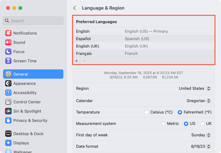 1. Then, use the plus sign button at the bottom of the Preferred Languages list to add another or the minus sign button to remove one.