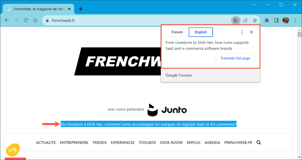 You’ll see a small window appear with the translation along with the option to translate the full page.