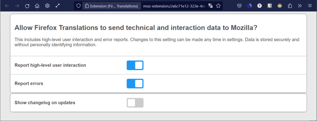 1. You’ll then be directed to the extension’s options page for allowing data to be sent to Mozilla. Turn on the toggles for the options you want to use and you can then close the tab.