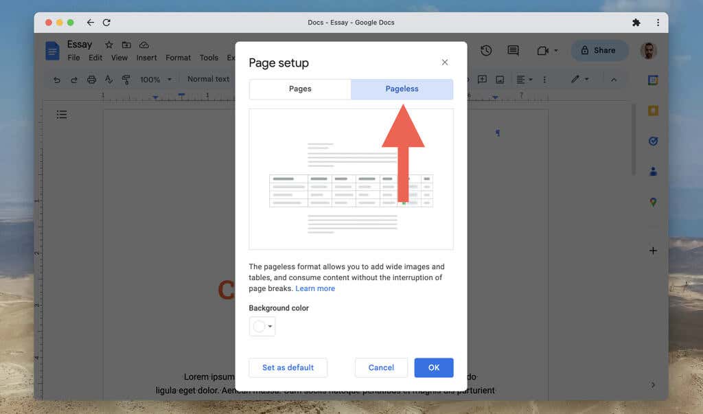 If you want to read through the contents of a Google Docs document without manual or automatic page breaks interrupting the flow, try switching the page setup to the Pageless format. To do that: